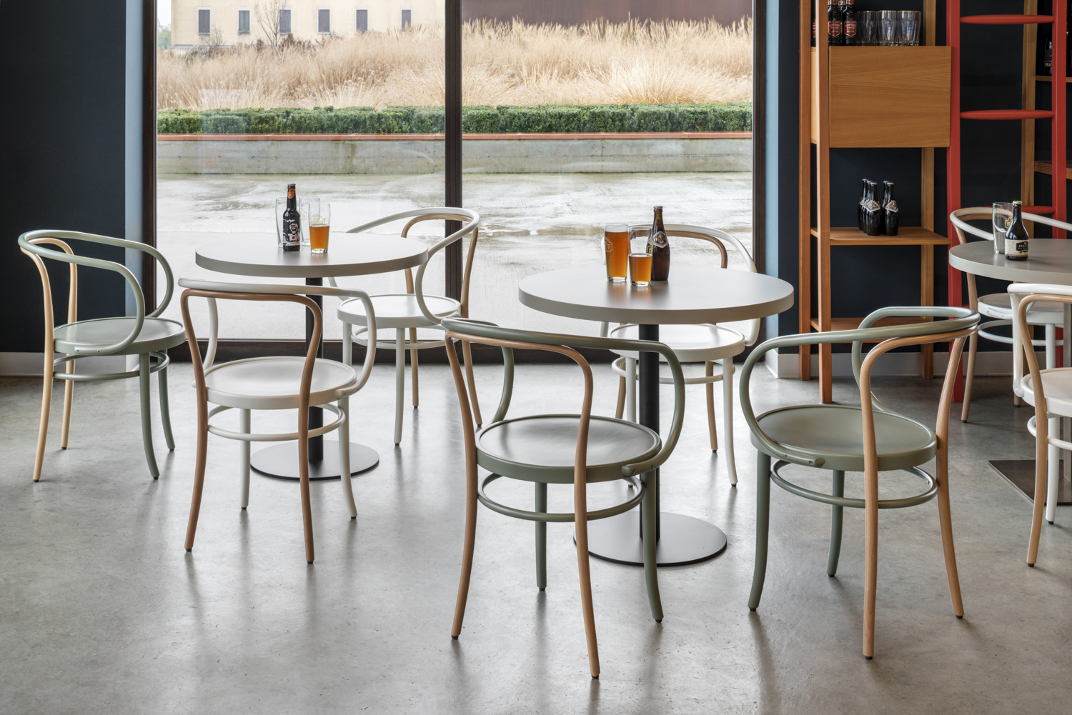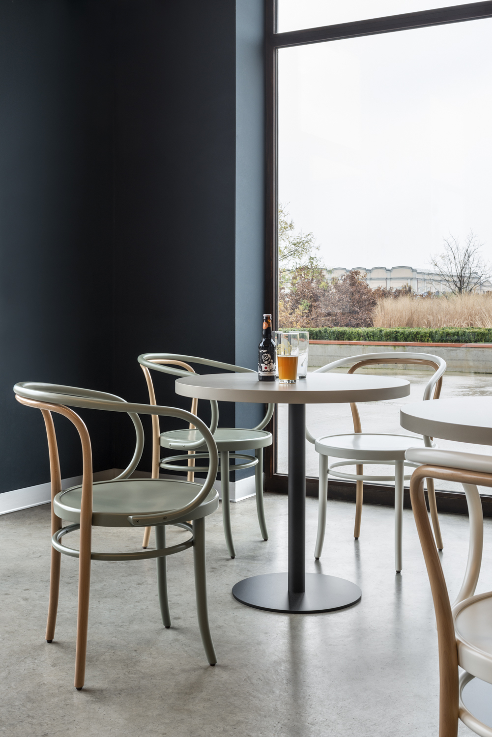 Die kantige Formensprache des Gestells und der Tischplatte verleiht dem sonst klassischen Kaffeehaustisch ein ausdrucksstarkes Gesicht. Praktisch und dabei zugleich zeitlos elegant fügt sich Porto damit problemlos in die unterschiedlichsten Objektbereiche. Die Tischplatte aus Schichtholz ist auch mit bronzefarbener Einfassung in dezentem Art-Déco-Stil erhältlich.