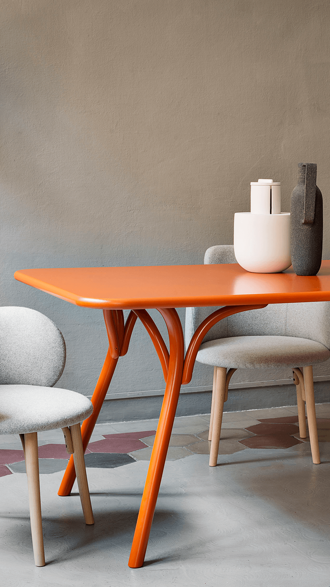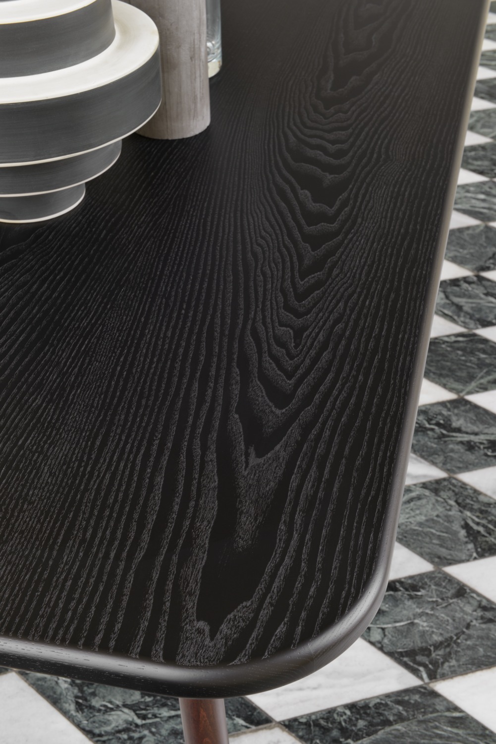 Der von der schwedischen Designer-Gruppe Front entworfene große Tisch ist durch sein Gestell aus dampfgebogenen Buchenholz gekennzeichnet, das die Ästhetik der Leichtigkeit mit der Festigkeit des massiven Holzes verbindet. Die Tischplatte aus Esche ist in zwei Größen erhältlich.
