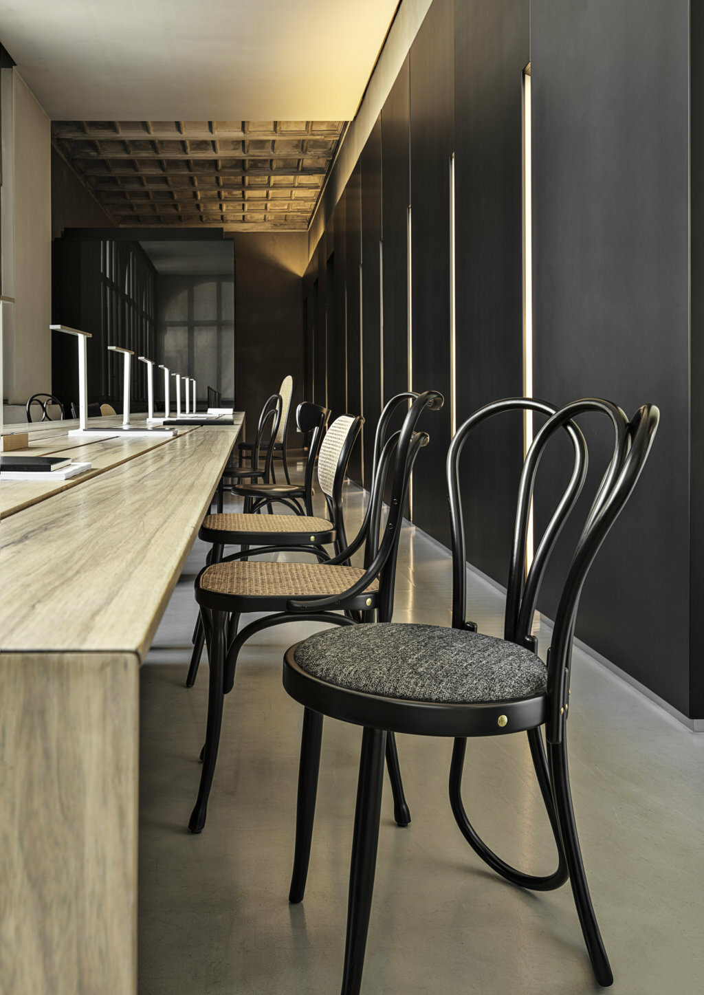 Fünf Bugholzelemente bilden zusammen die unverwechselbare Gestalt des Stuhls Post Mundus von Martino Gamper, der die traditionelle Formensprache des geschichtsträchtigen österreichischen Unternehmens aufgreift. Unbeschwert und mit einem gewissen Sinn für Humor treten die symmetrisch geformten Beine und die Rückenlehne in Dialog mit vergangenen Traditionen.