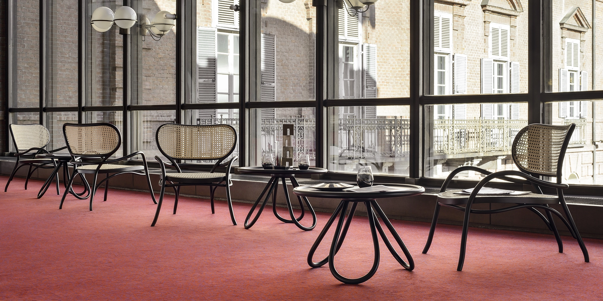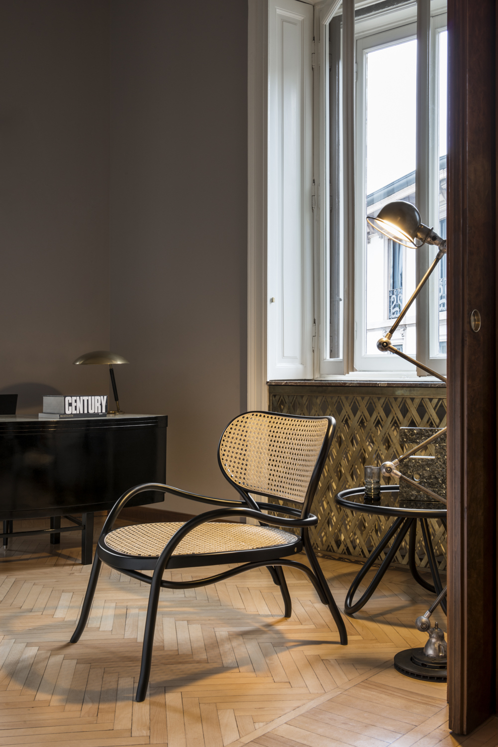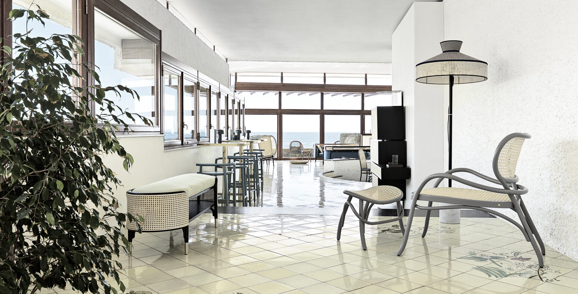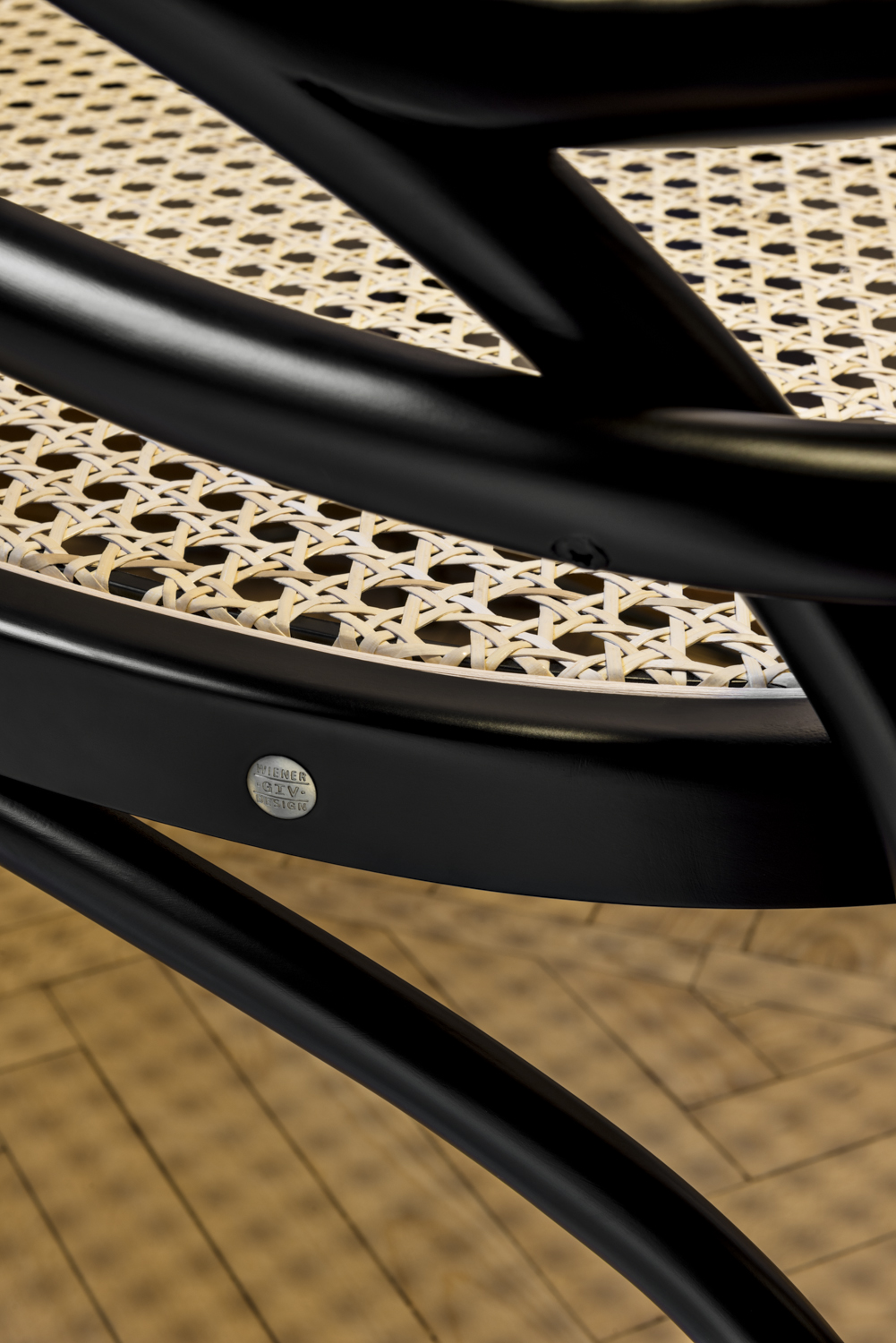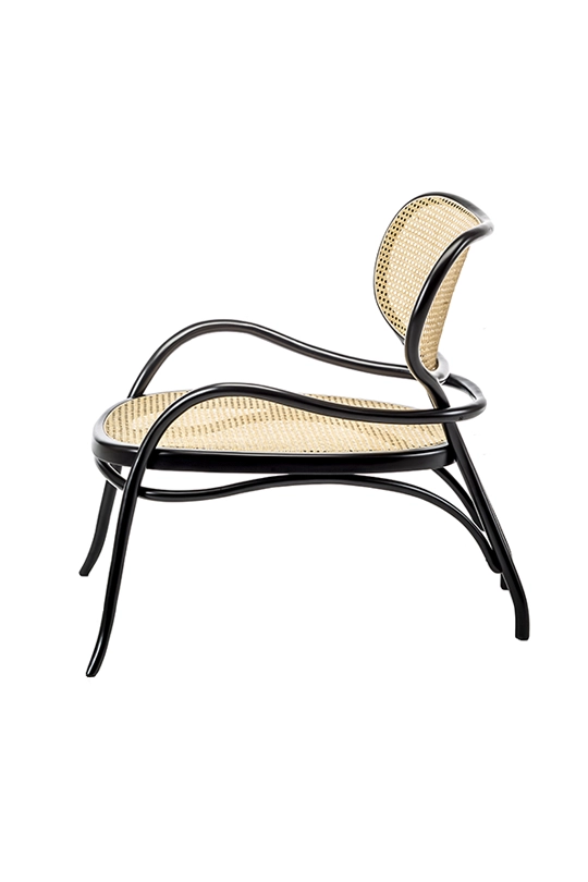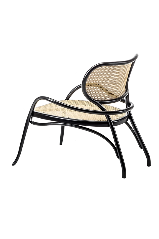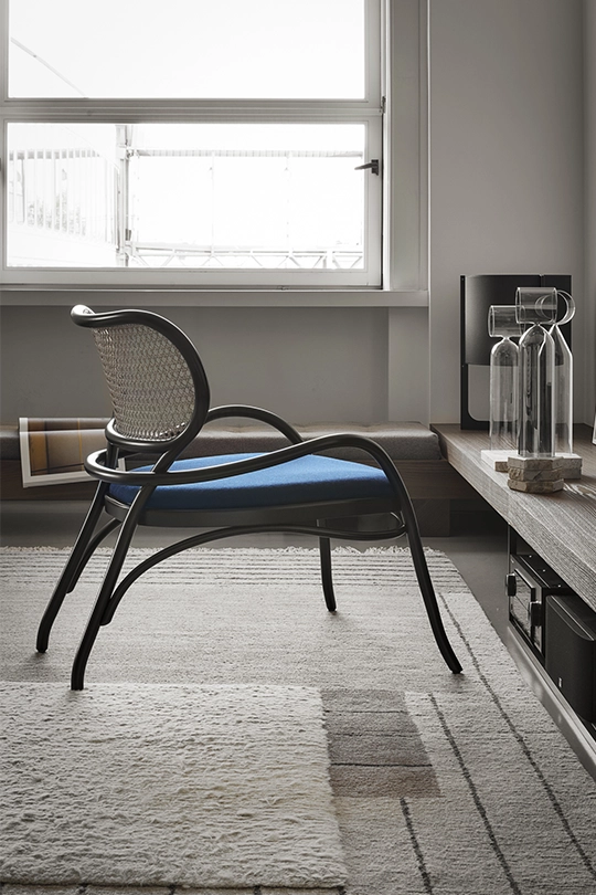 Nigel Coates has designed a sophisticated lounge chair with a complex design reflecting the stylistic features of the brand with refined skill. The seat and the comfortable backrest made of woven cane with a special large mesh version, are defined by the curves of the beech wood, processed with steam. The variable section structure is marked by its welcoming shape, enhanced by arm rests that amplify the shapes emphasizing the full lines of the backrest.