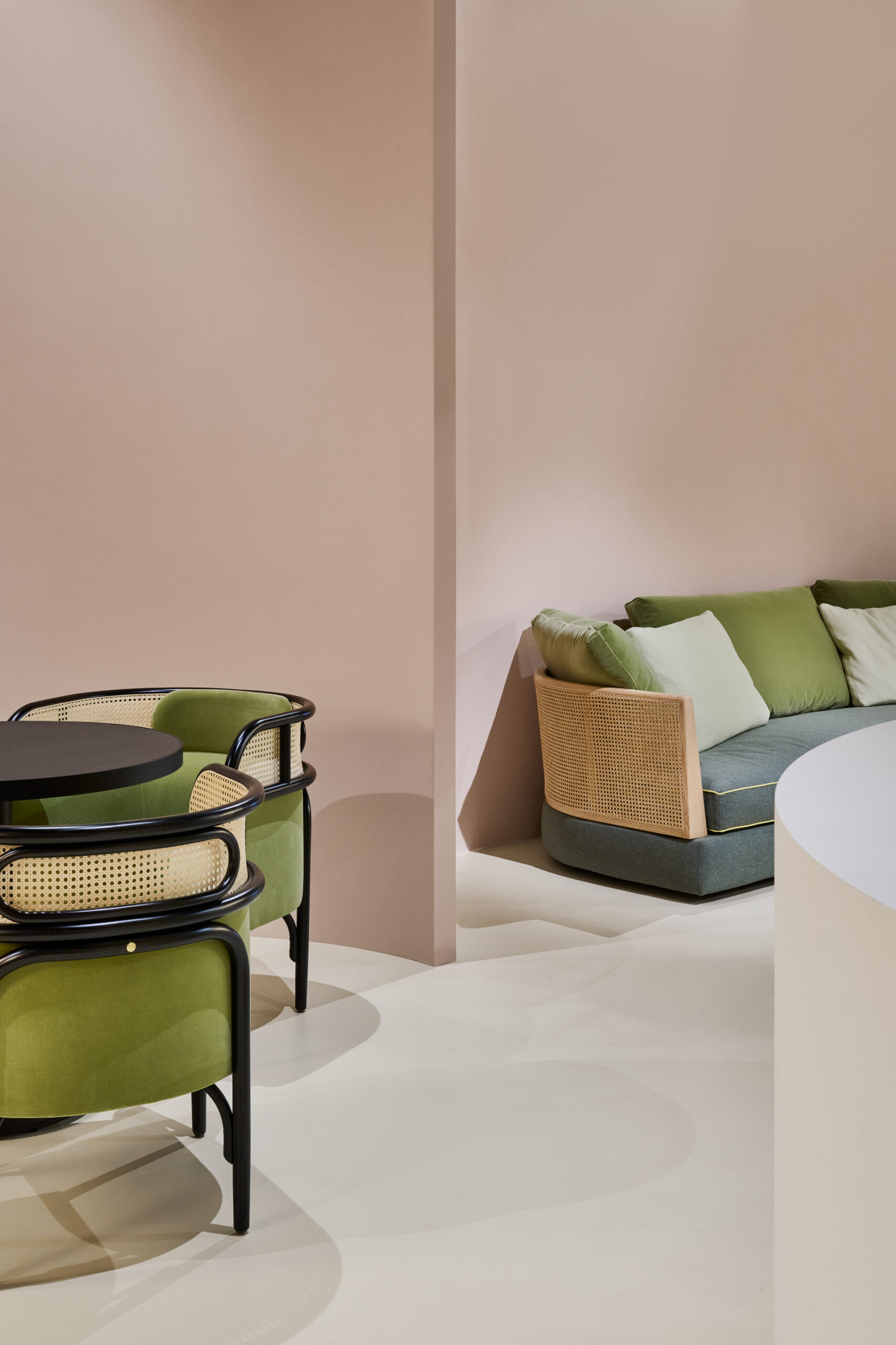 Dall’altro, il salotto residenziale arredato con la poltroncina Loop Lounge di India Mahdavi e i pezzi della collezione Mon-Île di Sergio Bicego, proposta di imbottiti introdotta lo scorso anno. Qui, l’atmosfera più vivace è data dagli accostamenti di colore audaci che esaltano il carattere contemporaneo e dinamico dell’idea di spazio residenziale Gebrüder Thonet Vienna.