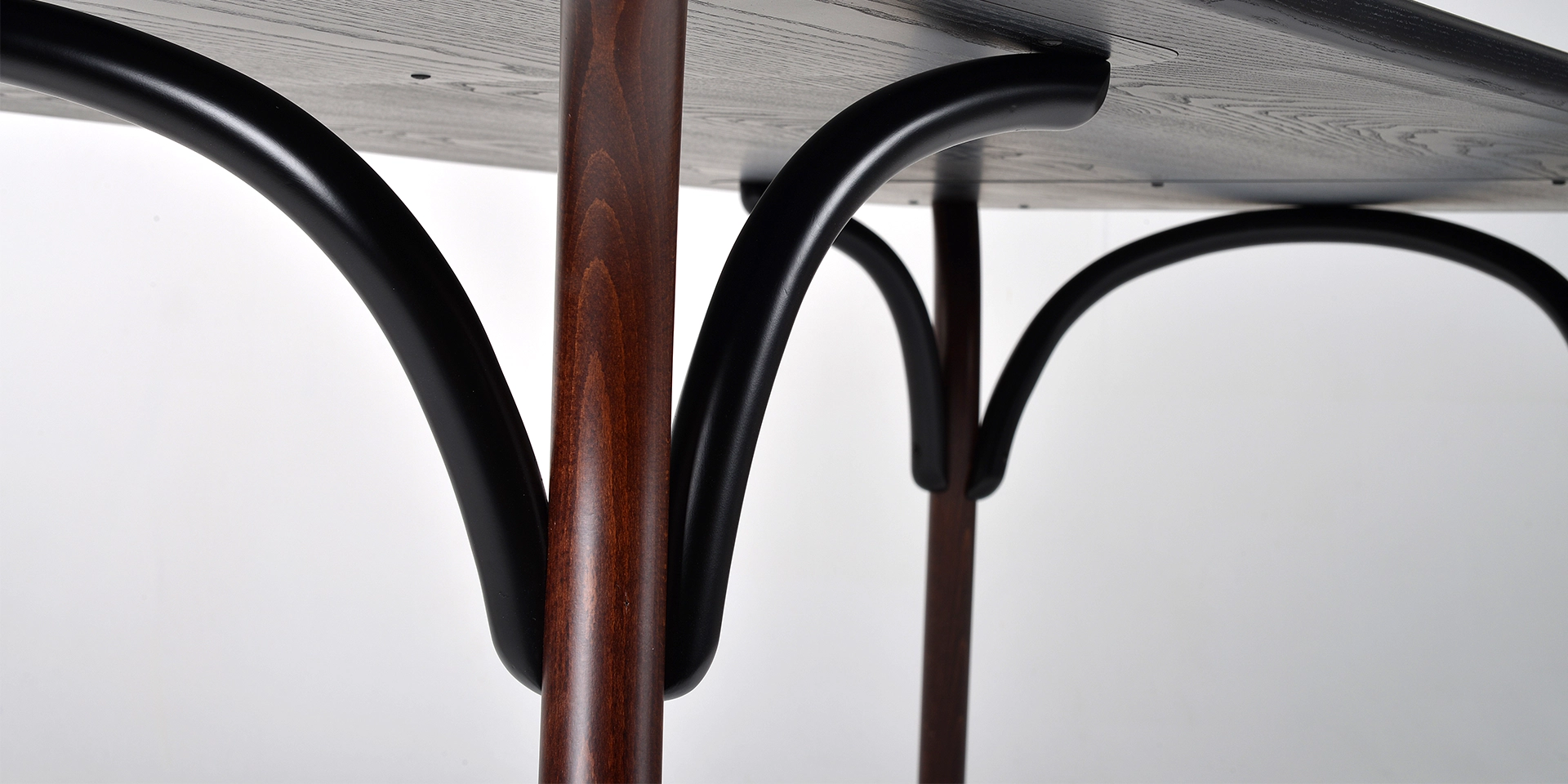 ARCH DINING TABLE: C01 RAL 9005 BLACK – B03 DARK WALNUT | C01 RAL 9005 BLACK – LIEZEN A04 025 | POSTSPARKASSE HOCKER: C01 RAL 9005 BLACK | WIENER STUHL: C01 RAL 9005 BLACK – LIEZEN A04 025