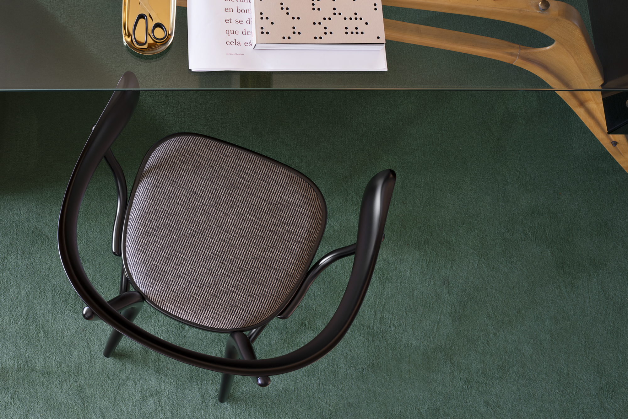 Riprendendo le sinuose forme della lounge chair LEHNSTUHL e della sedia BODYSTUHL, Nigel Coates presenta la poltroncina da pranzo BISTROTSTUHL, altra inedita rilettura in chiave contemporanea della tradizione Thonet. Estremamente confortevole ed ergonomica, si contraddistingue per lo schienale scultoreo dal carattere antropomorfo che ricorda la tipica forma triangolare delle scapole.