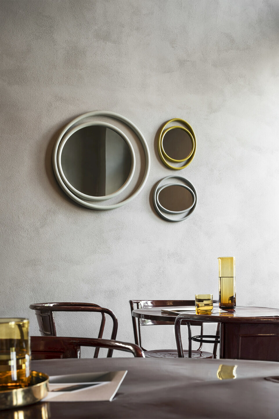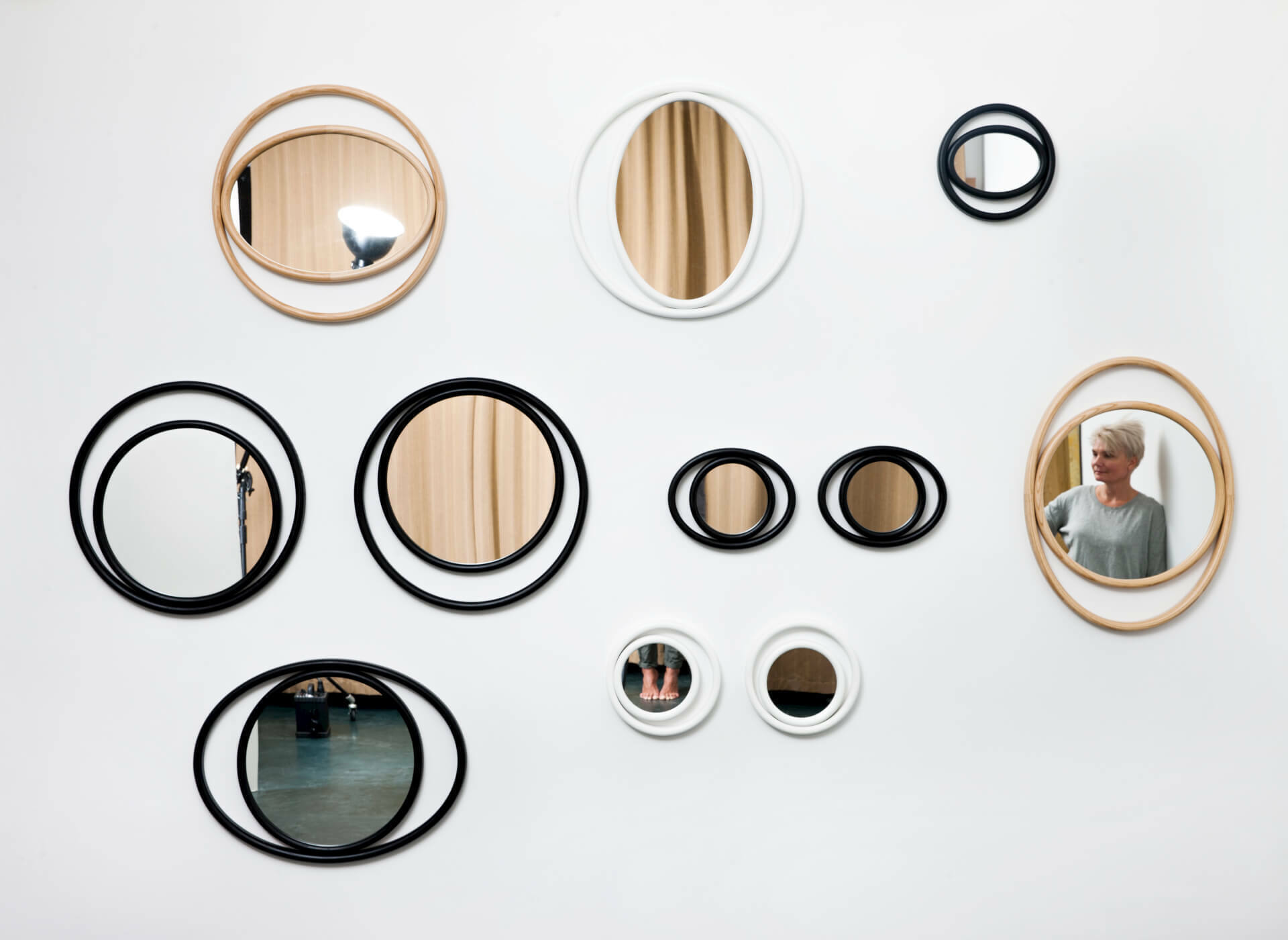 Forme geometriche semplici, circolari e ovali combinate, ricreano suggestioni scenografiche che evocano il potere mistico dell’occhio e definiscono il profilo degli specchi EYESHINE ideati dalla designer Anki Gneib. Il legno massello curvato a vapore racchiude la superficie riflettente e si modula su differenti grandezze, amplificando l’eco indagatore dell‘occhio.