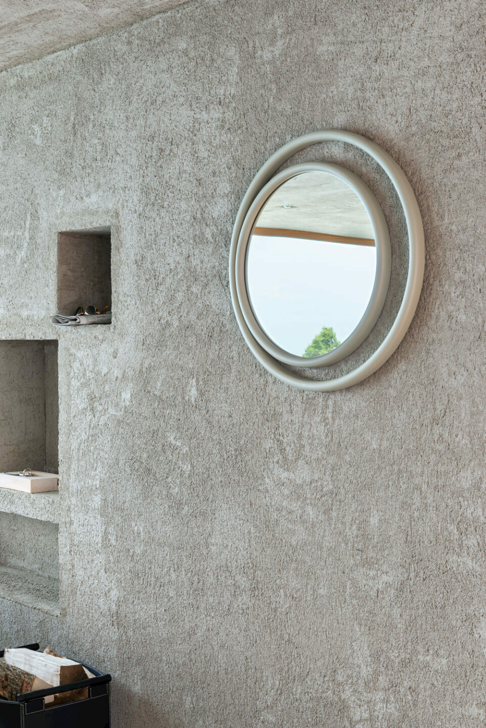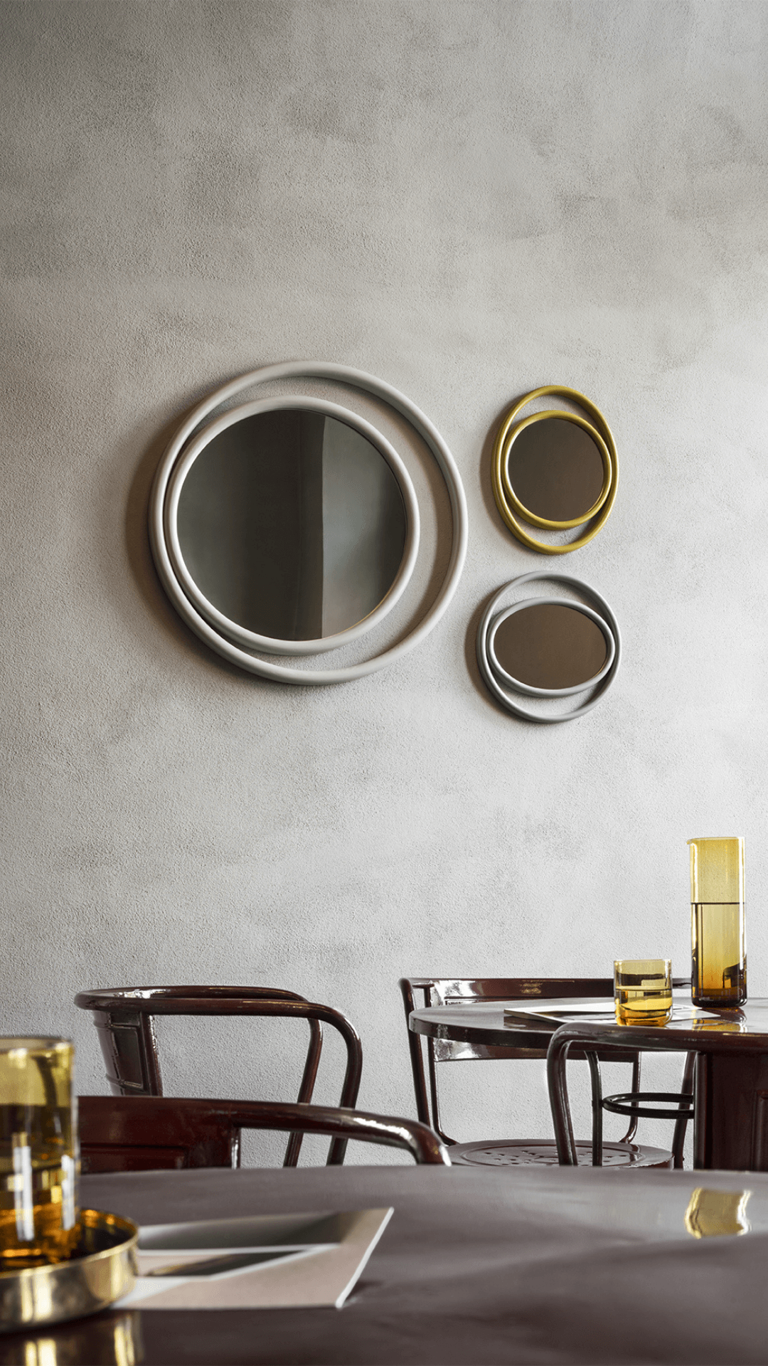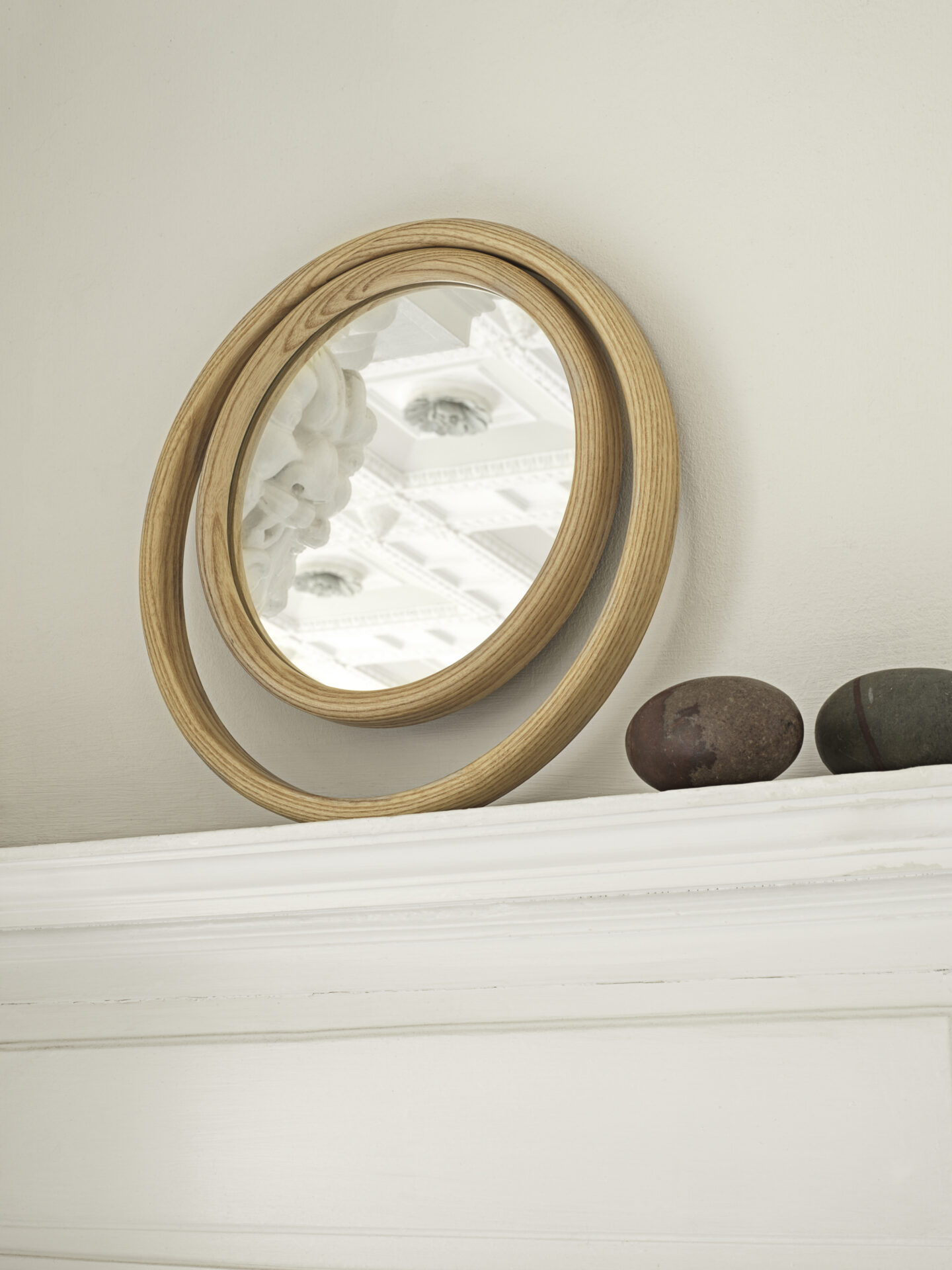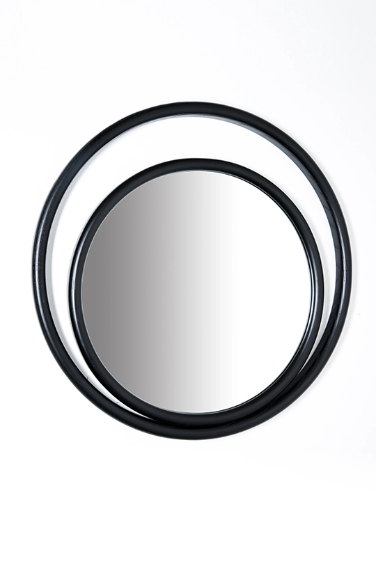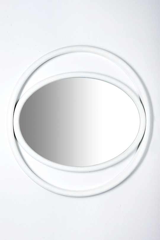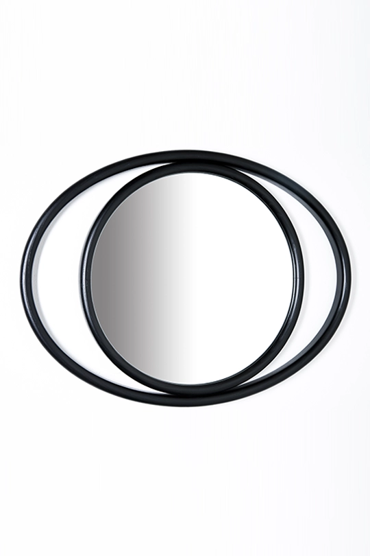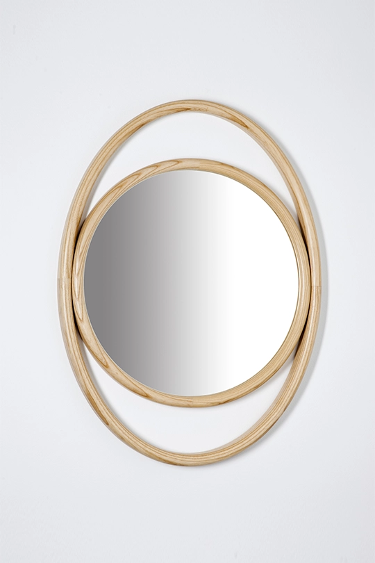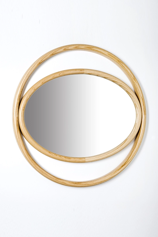 Forme geometriche semplici, circolari e ovali combinate, ricreano suggestioni scenografiche che evocano il potere mistico dell’occhio e definiscono il profilo degli specchi EYESHINE ideati dalla designer Anki Gneib. Il legno massello curvato a vapore racchiude la superficie riflettente e si modula su differenti grandezze, amplificando l’eco indagatore dell‘occhio.