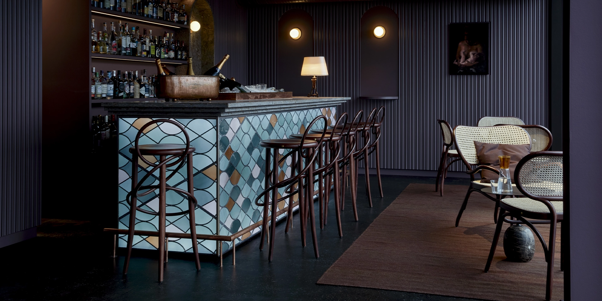 Nigel Coates firma una lounge chair sofisticata, caratterizzata da una complessità progettuale che declina gli stilemi del marchio con raffinata maestria: la seduta e il comodo schienale in paglia di Vienna, realizzata in una particolare versione a trama larga, vengono definiti dalle curve del legno di faggio lavorato a vapore.
