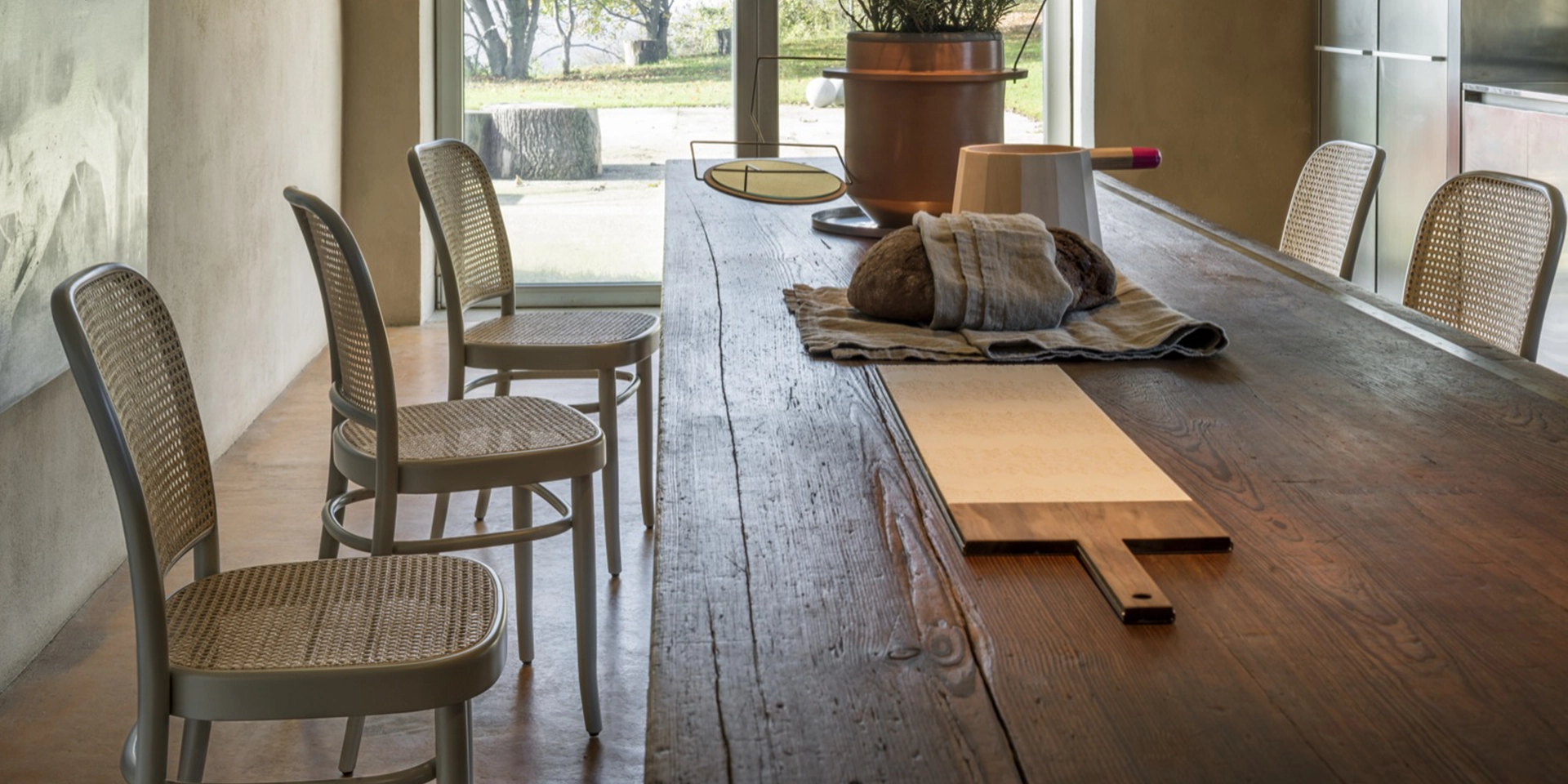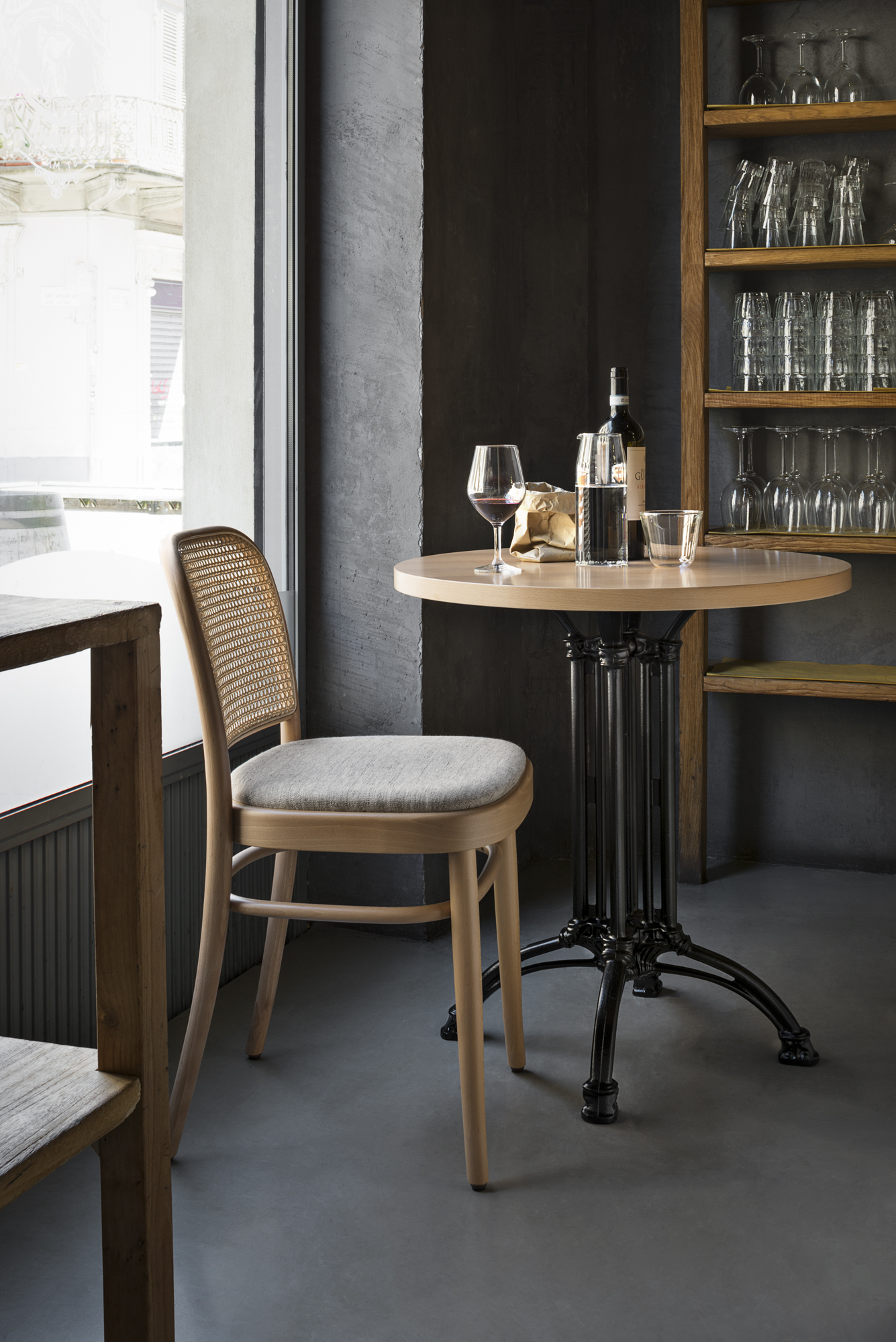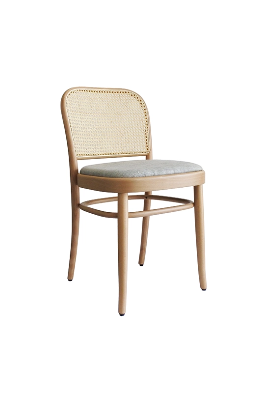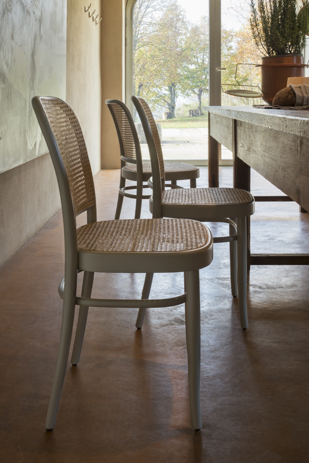 Sedia e sgabello in massello di faggio curvato a vapore, disegnata da Josef Hoffmann nel 1930. Un design sempre attuale e moderno conferisce alla sedia N. 811 un incredibile confort e leggerezza. Il sedile e lo schienale sono in paglia di Vienna. Disponibili in tre versioni: seduta e schienale in paglia di Vienna, seduta imbottita e schienale in paglia di Vienna, seduta e schienale imbottiti.