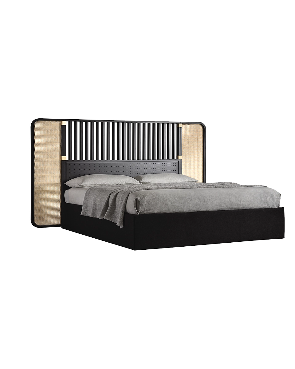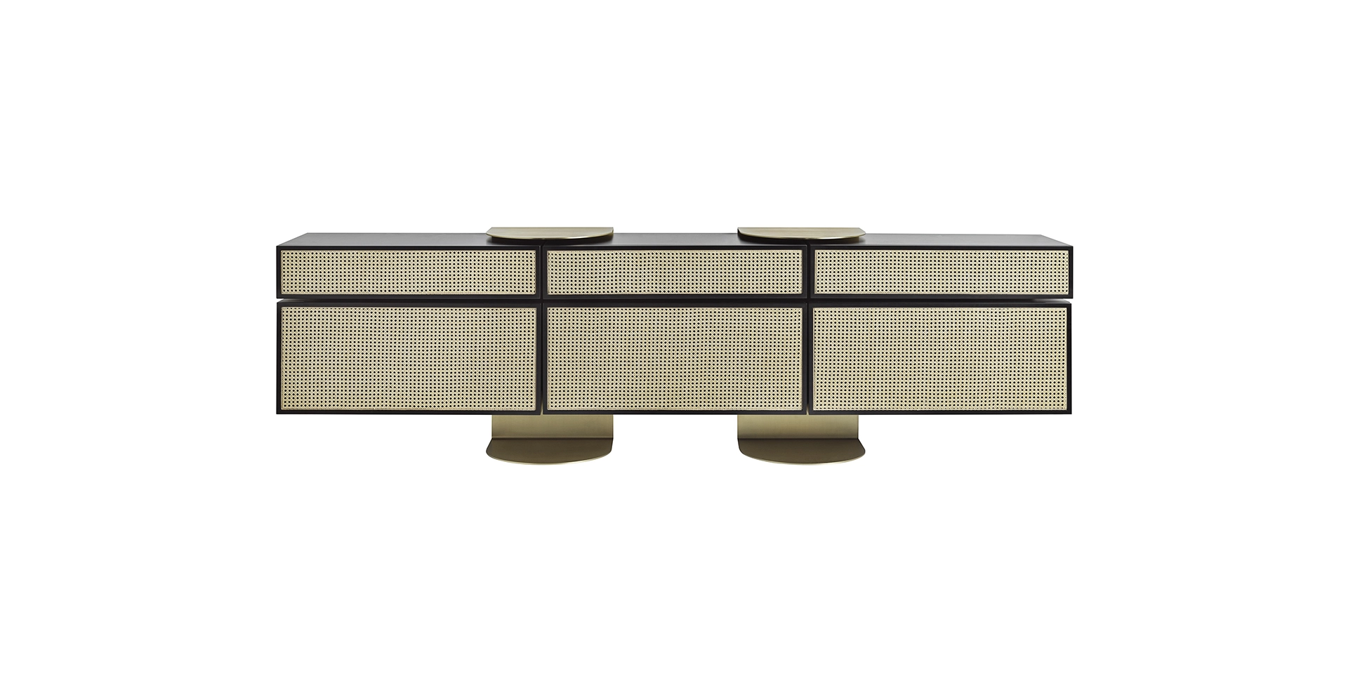 NYNY Sideboard è una madia a sviluppo orizzontale in legno laccato e paglia di Vienna da fissare a parete grazie alla struttura in metallo con finitura in ottone satinato. Si caratterizza per la forza del linguaggio creativo tipico degli storagemilano, calibrato incontro tra la creatività da designer e il linguaggio progettuale degli architetti.