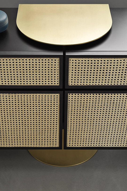 NYNY Sideboard è una madia a sviluppo orizzontale in legno laccato e paglia di Vienna da fissare a parete grazie alla struttura in metallo con finitura in ottone satinato. Si caratterizza per la forza del linguaggio creativo tipico degli storagemilano, calibrato incontro tra la creatività da designer e il linguaggio progettuale degli architetti.