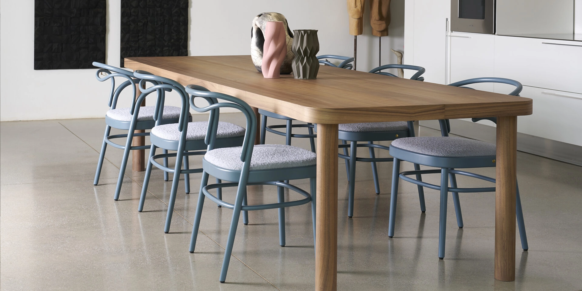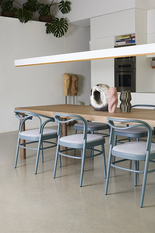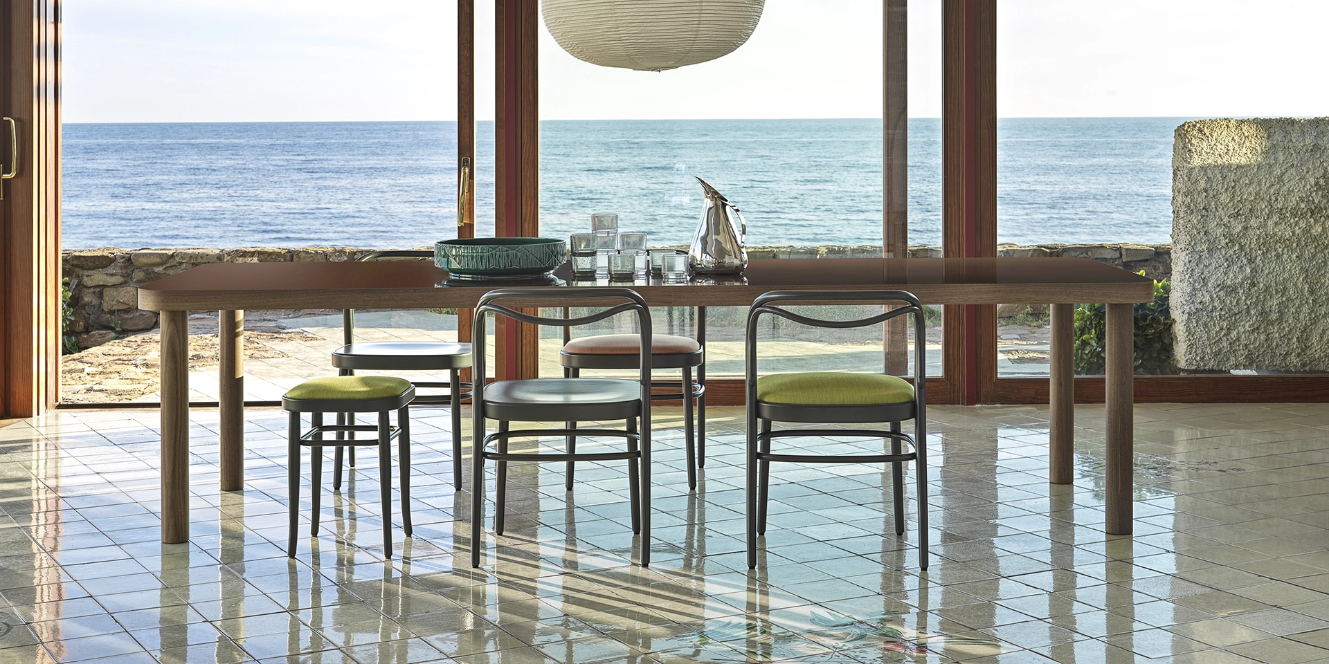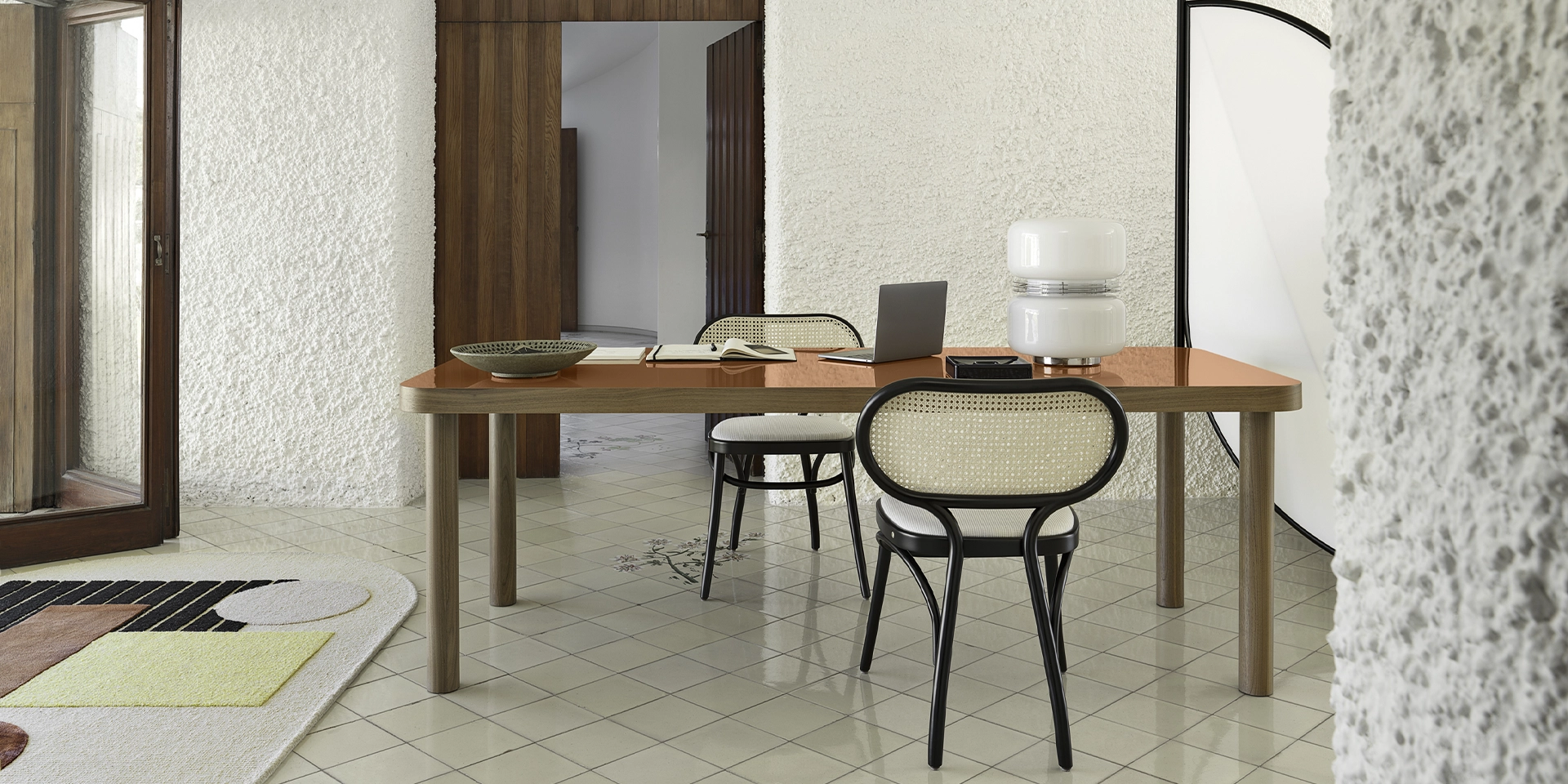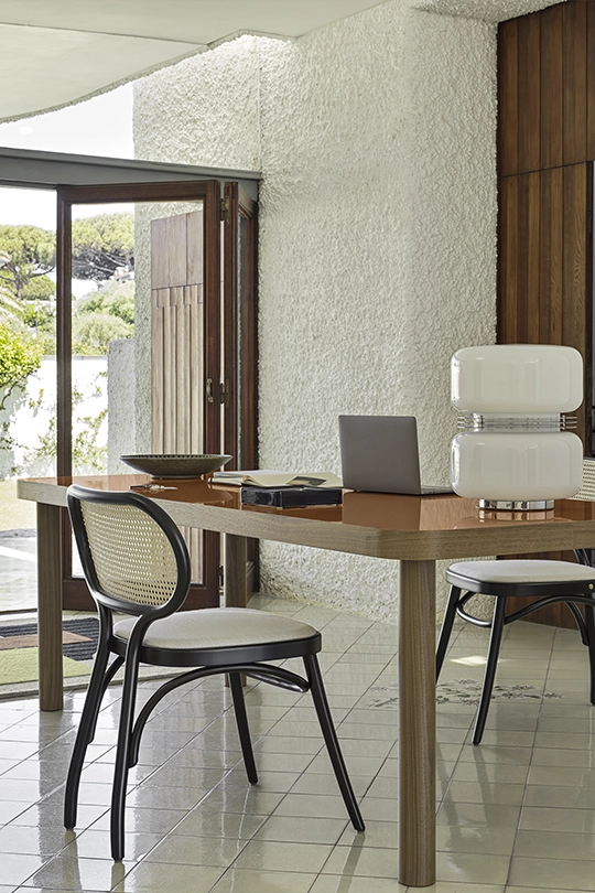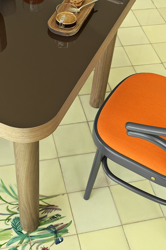 Fabio Fantolino, in profonda sintonia stilistica con l’azienda, con il suo tratto rigoroso e al contempo poetico ha creato il nuovo tavolo SÄULE , dal tedesco colonna. Ampio tavolo rettangolare, proposto in due misure, caratterizzato da quattro gambe tornite in noce canaletto massello e un top a forte spessore con bordature in massello di noce e un piano in laminato HPL lucido. Gli angoli curvi sono ispirati alle tradizionali linee curve del marchio. Il top è disponibile nei colori di collezione: arancio, marrone e rosso prugna.