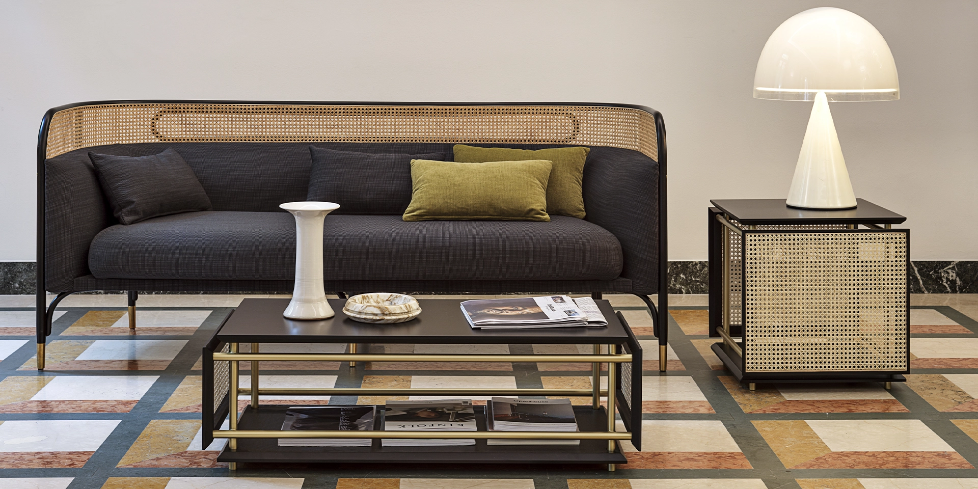 Segno identificativo di Gebrüder Thonet Vienna GmbH, la paglia di Vienna in un raffinato equilibrio compositivo con il legno e il metallo, è l’elemento caratterizzante del progetto dei tavolini WIENER BOX di Cristian Mohaded. Proposta d’arredo dal registro progettuale rigoroso, ispirato dalle linee pure ed essenziali della leggera struttura in metallo, una scatola sospesa i cui confini sono definiti dai pannelli laterali in paglia di Vienna con cornici in legno come i piani laccati.