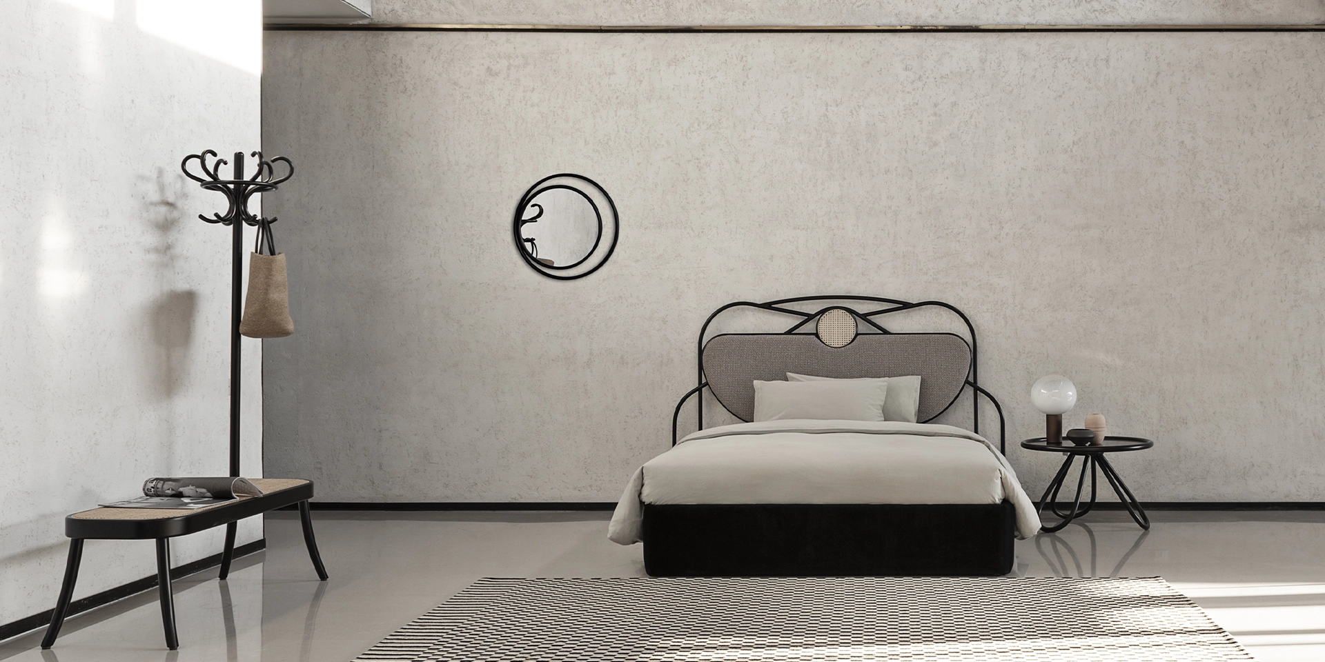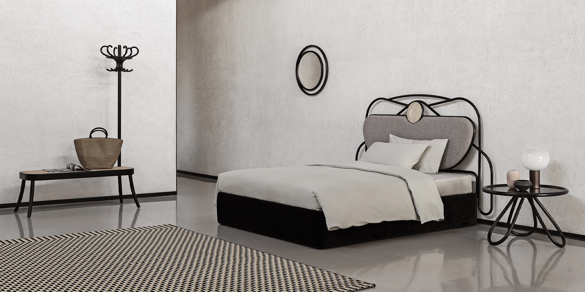 ARCH COFFEE TABLE: C01 RAL 9005 BLACK | COAT RACK BENCH: C01 RAL 9005 BLACK | YVETTE: C01 RAL 9005 BLACK – | EYESHINE MIRROR: C01 RAL 9005 BLACK