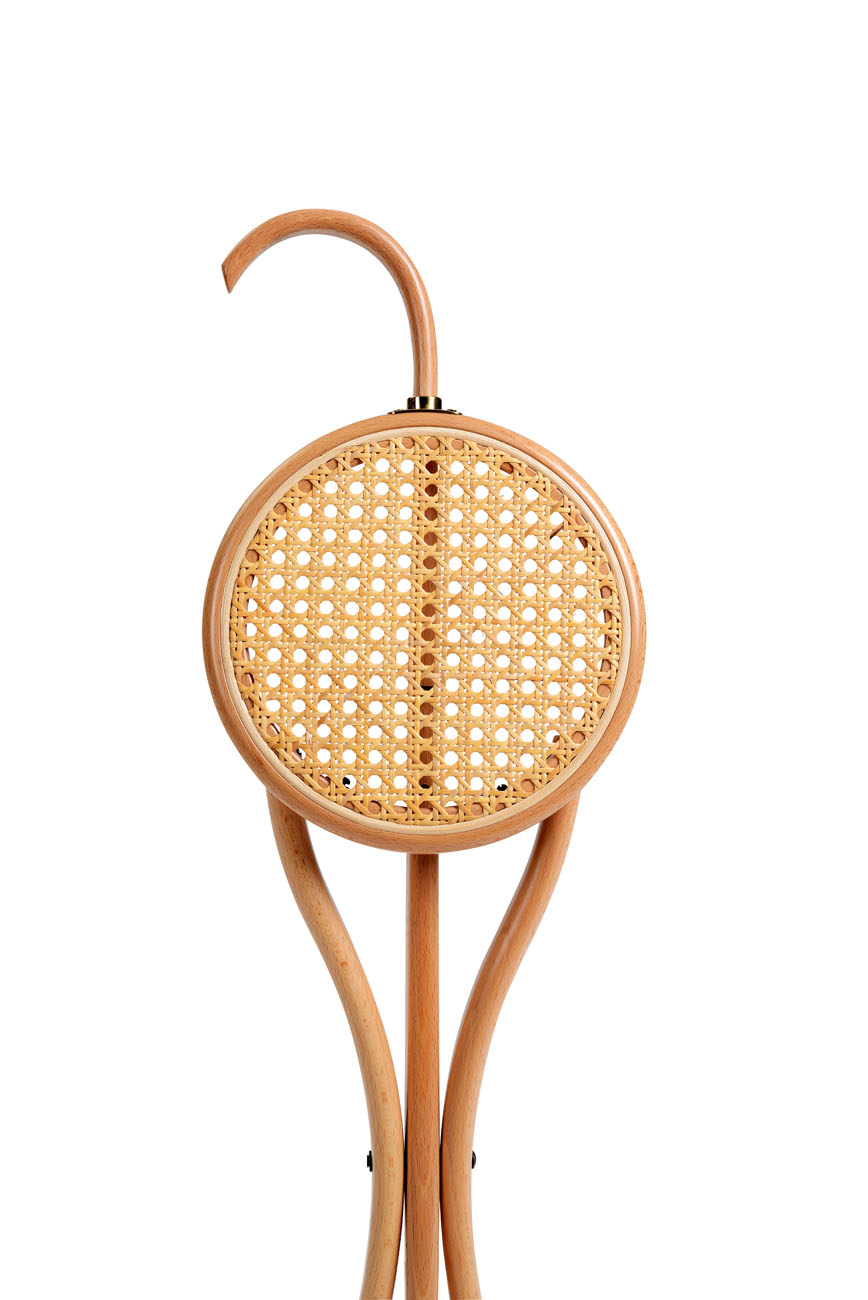 Une réédition qui séduit avec son charme historique. Une canne ou un tabouret pliant avec une assise cannée en hêtre courbé, naissant du raccord curviligne de trois membrures. Le manche, plié en col de cygne, sert de dossier. La tradition raconte que l’impératrice Elisabeth d’Autriche l’aurait acheté dans la célèbre Strauchgasse, la rue historique du shopping viennois et qu’elle ne s’en serait jamais séparée pendant ses voyages en Europe.